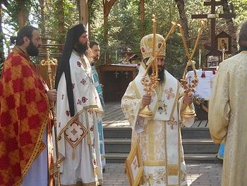 Following the Pannikhida and the evening meal Small Compline and Matins were served in the monastery church. In the morning the services began in the church with Midnight Office and the Hours, after which those gathered again processed to the grave of Fr. Seraphim to celebrate the Divine Liturgy, which was served quietly and beautifully. As main celebrant, Met. Saba, along with Abbot Damascene, was again joined by Frs. Evtimi, Arsenie, Ilarion, and Paisy, as well as Fr. Nektarios Rozadilla of St. George Greek Orthodox Church in Redding, CA, and Fr. Ian Shipley and Dcn. David Greenfield of Sts. Cyril and Methodios Church (OCA) in Chico, CA. The celebrants served again in English, Georgian, and Serbian, with the brotherhood choir responding peacefully in English and Slavonic. Altogether about fifty people were in attendance, many receiving Holy Communion.