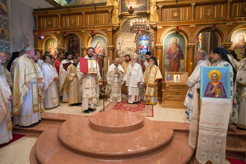 По уласку Његове Светости у цркву, епископи Максим и Јустин су изнели икону Светог Севастијана Санфранциског и Џексонског из олтара и приказали је Његовој Светости и архијерејима. Епископ Лонгин је прочитао званичан текст - одлуку о проглашењу светим Светог Архијерејског Сабора од 26. маја 2015. године.