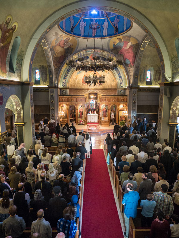 Епархијско свештенство као и гостујући свештеници из Епархија источноамеричке и Новограчаничко-средњозападноамеричке, као и из Канаде, а да не спомињемо и онај велики број из свеправославне заједнице из шире околине Лос Анђелоса, направили су дугачку поворку док су пратили Његову Светост Патријарха српског г. Иринеја и све архијереје на уласку у препуну цркву, при чему су многи верници остали испред цркве, где им је био обезбеђен пренос богослужења на видео биму.