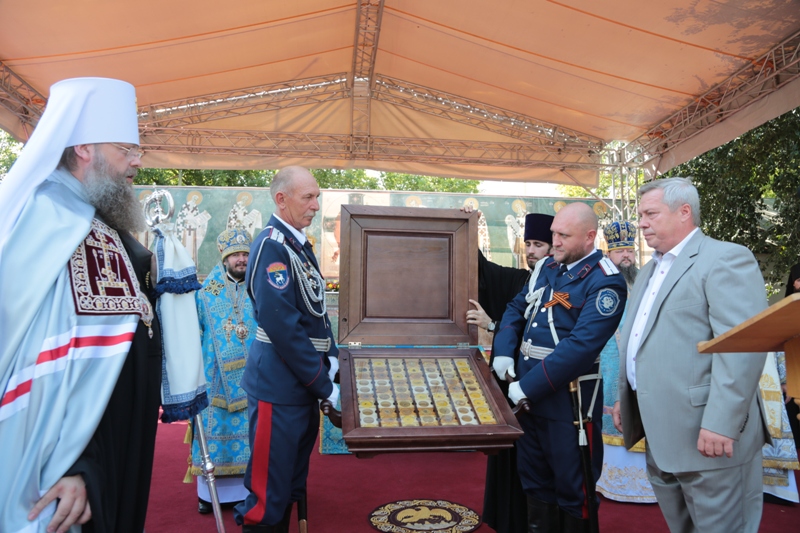 В день празднования в честь Донской иконы Божией Матери в станице Старочеркасской временно исполняющий обязанности Губернатора Ростовской области Василий Голубев по просьбе благотворителей передал Донской митрополии обретенную христианскую святыню — ковчег с частицами святых мощей и Древа Креста Господня, сообщает сайт Ростовскай епархии.