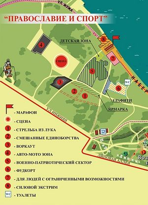 Праздник «Православие и спорт» будет организован на 10 тематических зонах. Для гостей будет работать Ярмарка сувениров, детская площадка и фудкорт.