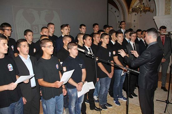Свечана академија поводом петнаест година од поновног увођења верске наставе у образовање Србије почела је молитвом Оче наш и химном Боже правде, коју су здружено и громогласно у крипти храма појали ученици Војне гимназије и богослови наше Богословије Свети Сава, под диригентским вођством г. Бранка Тадића .