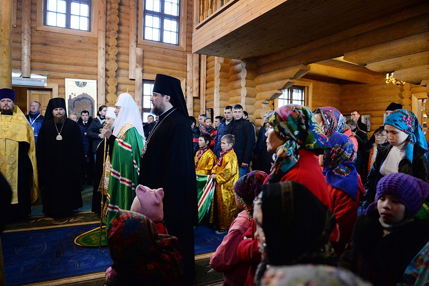 Затем Святейший Владыка прибыл в храм в честь Архистратига Божия Михаила, сооруженный недавно в Лаборовой при поддержке администрации Ямало-Ненецкого автономного округа. В церкви, где собрались жители фактории — представители коренных народов Ямала, Святейший Патриарх Кирилл совершил молебен.