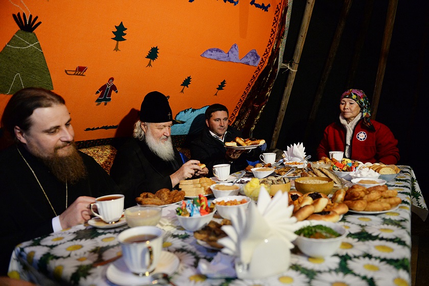 Затем Святейший Патриарх Кирилл и сопровождающие его лица посетил чум — традиционное жилище ненцев. Здесь, согласно местным обычаям, гости были посажены на шкуры животных. Им были предложены угощения из местных продуктов — рыбы и ягоды.