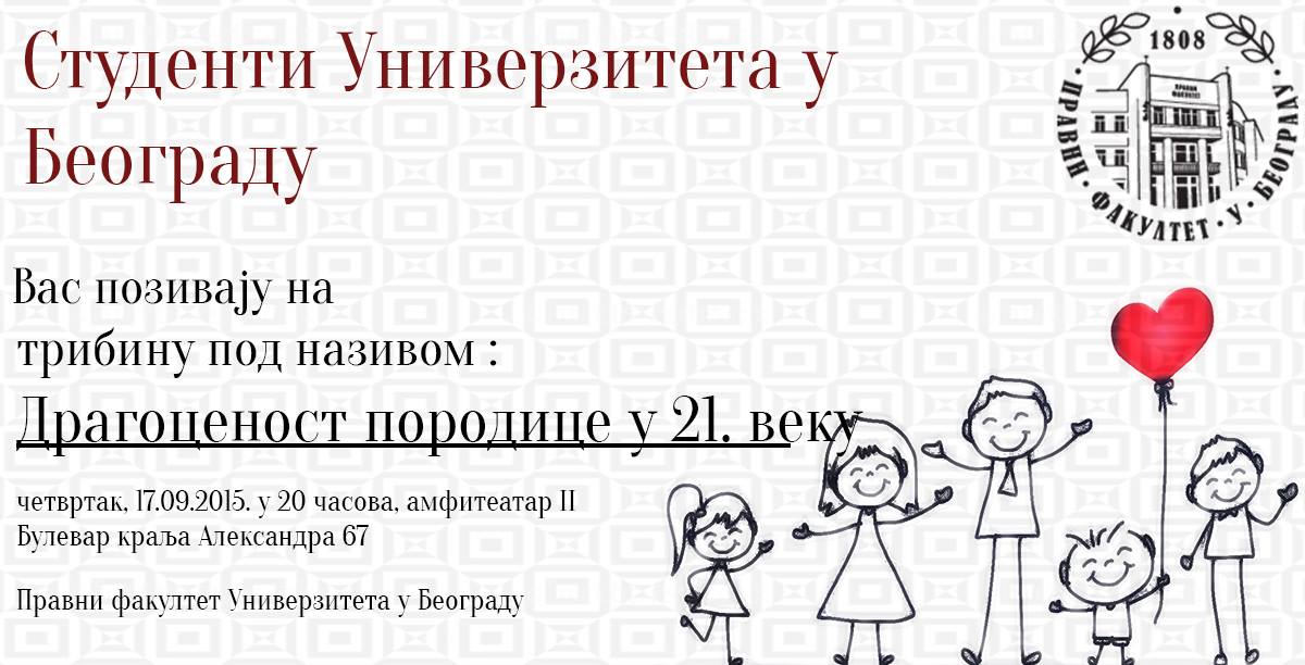 Студенти Универзитета у Београду Вас позивају на трибину " Драгоценост породице у 21. веку " која ће бити одржана 17. септембра у 20 часова на Правном факултету у Београду. Дођите да заједно одбранимо породицу !