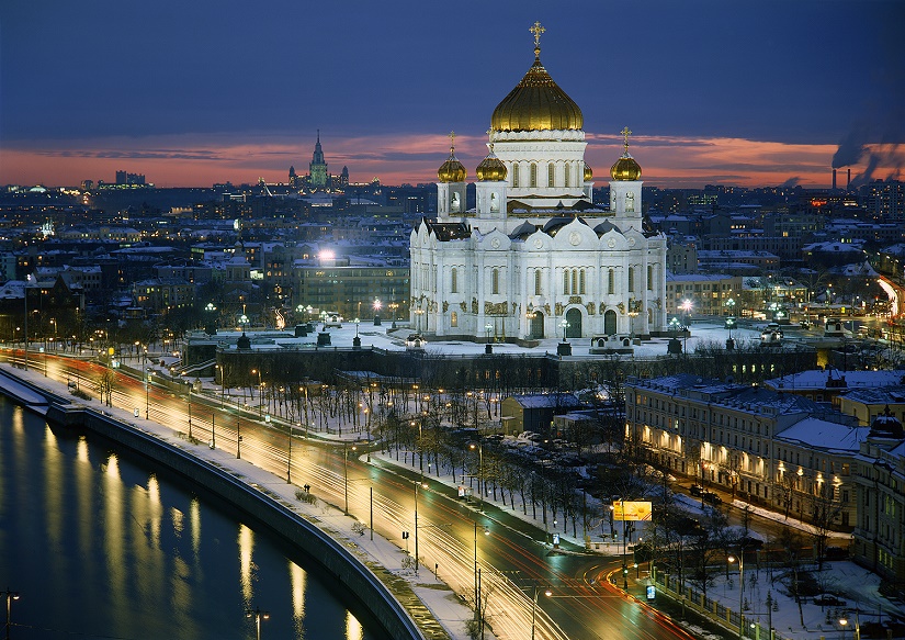 Stunning nightime view of the Cathedral of Christ the Saviour set against the backdrop of snow covered Moscow