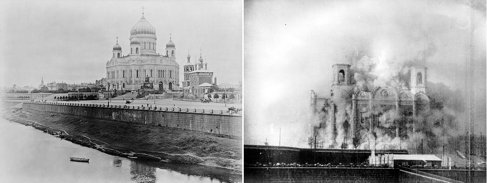 The cathedral as it looked in the early 20th century (right); Its demolition in December 1931 (left)