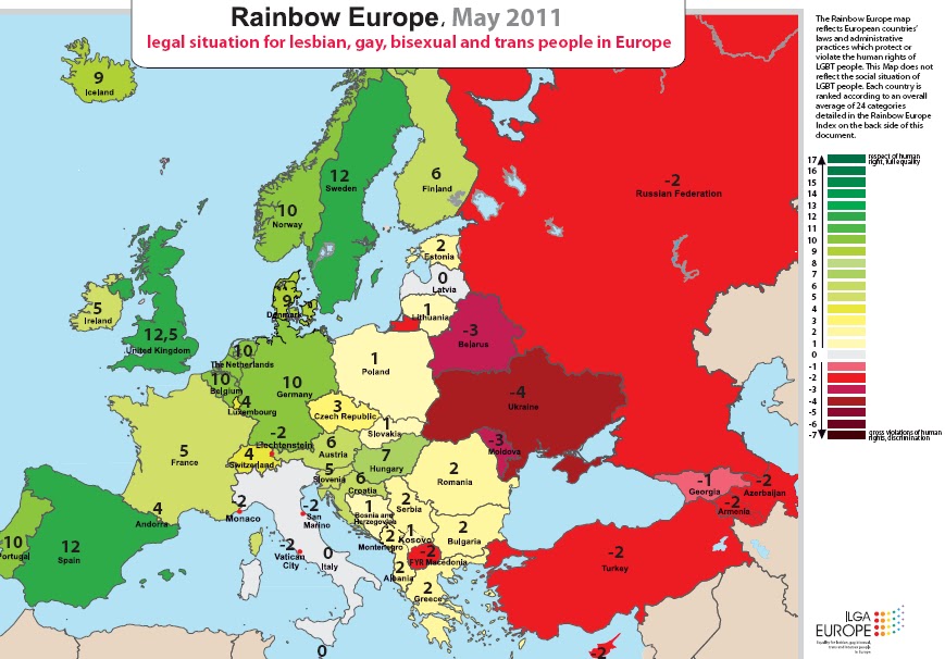 Карта Европе коју су 2011. године сачинили изопачењаци и која одражава заштиту њихових права по 24 показатеља. Зеленом бојом су обојене земље с максималним режимом повољним за изопачењаке, а црвеном бојом оне које су у том смислу минимално повољне.