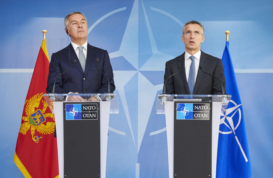 Бессменный премьер-министр Черногории Мило Джуканович и генеральный секретарь НАТО Столтенберг, приветствующий «реальный прогресс в направлении членства Черногории в НАТО», 15 апреля 2015 г.