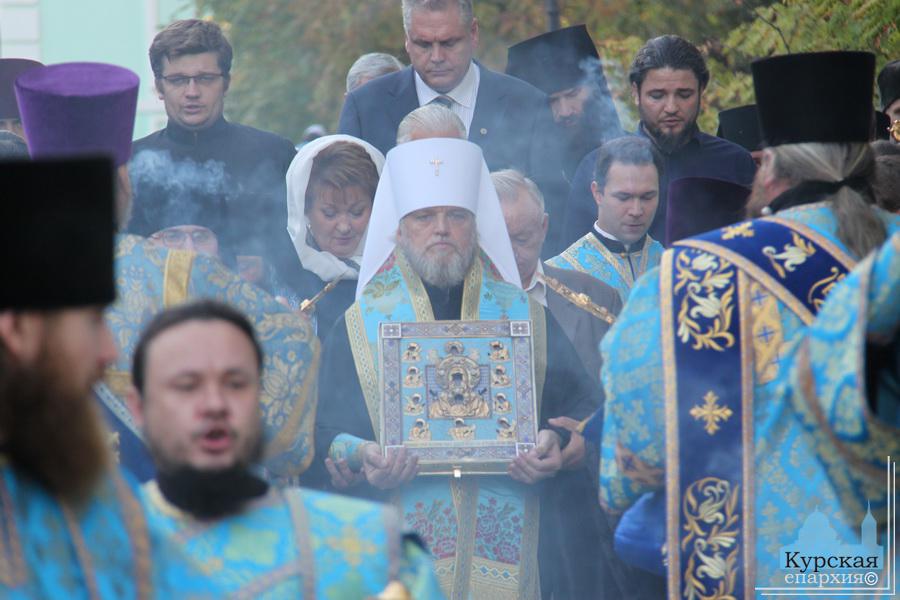 У ворот древней обители святыню встречали митрополит Курский и Рыльский Герман, епископ Железногорский и Льговский Вениамин, наместник Курской Коренной Рождества Пресвятой Богородицы мужской пустыни игумен Серафим (Котельников) с братией, священство Курской митрополии и многочисленные паломники.