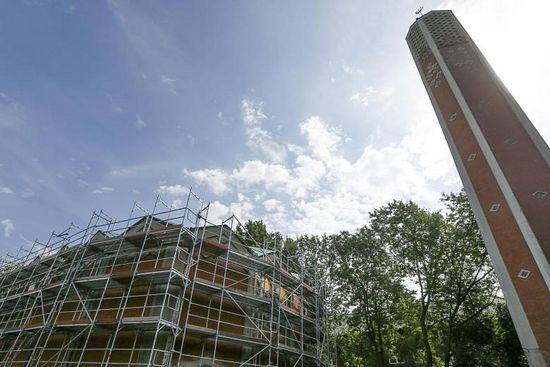 Строительные леса вокруг бывшей Капернаум-кирхе. Церковь будет перестроена в мечеть, колокольню бывшей церкви украшает теперь полумесяц. Фото: DPA