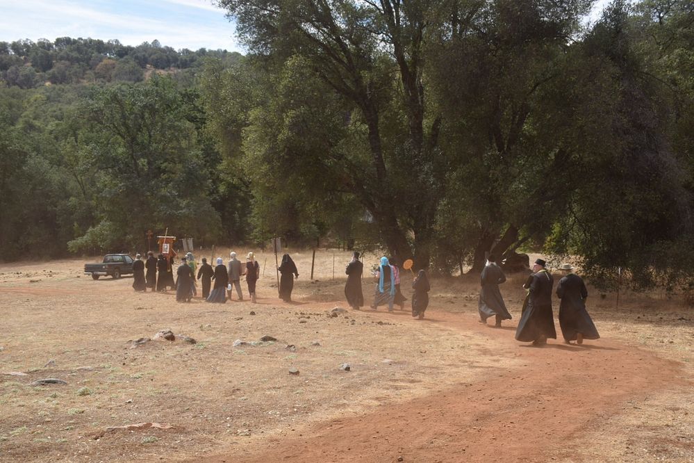 После богослужения был совершен крестный ход. С крестом, хоругвями, честными мощами и недавно написанным специально для обители образом преподобного отца Силуана духовенство, хор и верующие чинно прошли по монастырскому участку, освящая место основания будущих келий, кладбища и поклонного креста, водруженного на вершине холма.