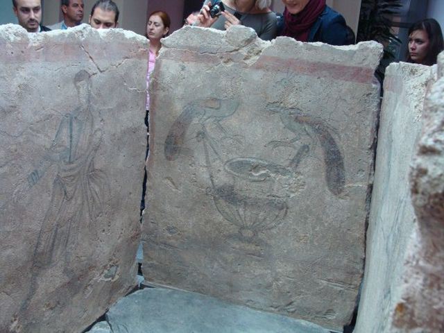 According to the experts, the image of the kantharos with the peacocks symbolizes the source of life and/or faith in resurrection and eternal life in Christianity. A similar depiction can be seen in one ofPlovdiv’s Early Christian basilicas.