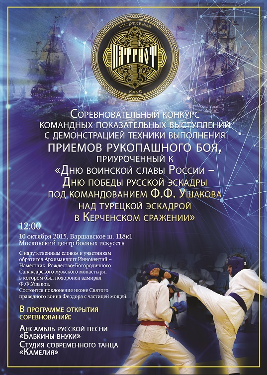 10 октября 2015 года в Москве в Центре боевых искусств по адресу Варшавское шоссе, дом 118/1, региональная молодежная общественная организация «Спортивный клуб «Патриот» проводит Соревновательный конкурс по рукопашному бою среди юношеских команд Москвы и Московской области, посвященный Дню воинской славы России – «Дню победы русской эскадры под командованием Ф.Ф.Ушакова над турецкой эскадрой в Керченском сражении».