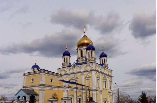 При въезде в город со стороны железнодорожного вокзала голубые купола Вознесенского собора видны издалека. Подъехав к нему вместе со своим спутником, липецким краеведом Александром Клоковым, выхожу из машины и останавливаюсь, чтобы полюбоваться персиковыми стенами главного церковного дома Ельца.