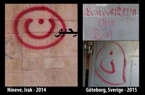 Слева: внутри красного круга - метка "н" (что означает "назаряне"), сделанная ИГ на христианском доме в Мосуле. Справа - такая же метка в Гетеборге