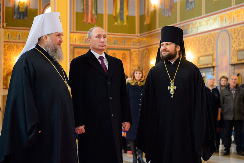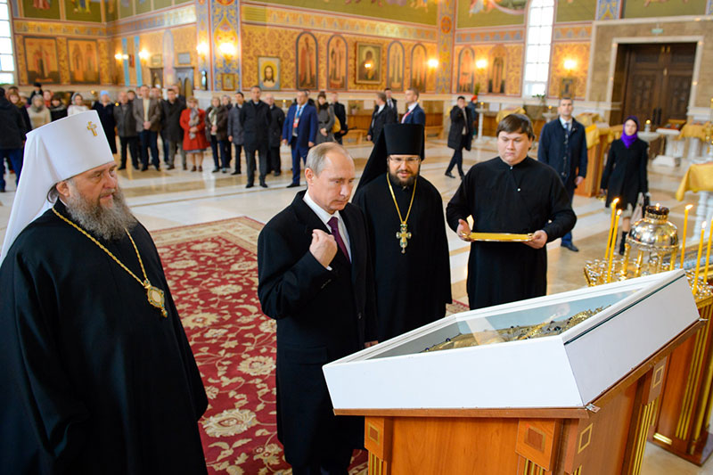 Руски председник је целивао светиње у храму – Фјодоровску-Астанајску икону Мајке Божије (тачну копију чудотворне Фјодоровске иконе Богородице, која је освећена испред јављене иконе у Костроми) и честицу моштију апостола Андреја Првозваног.