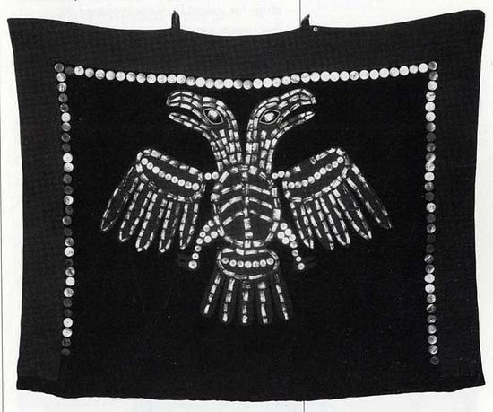 Тлингитское рельефное одеяло, конец 19 в. Двуглавый орел, напоминающий имперский герб, свидетельствует о русском влиянии. Орел также является героем тлингитских мифов. Таким образом, двуглавый орел в данной работе означает слияние тлингитской и русской культуры в 19 в.