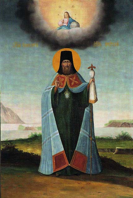 Икона Святителя Иннокентия написана в конце 19 в. масляной краской на холсте, ее размер – 92.1 х 64.8 см. Она находится в часовне св. Александра Невского в г. Акутан, Аляска. Хотя икона принадлежит руке неизвестного иконописца, особенности стиля выдают ее алеутское происхождение. В частности, безлесый пейзаж типичен для островов Алеутского архипелага. Икона была отреставрирована в 1993 г.