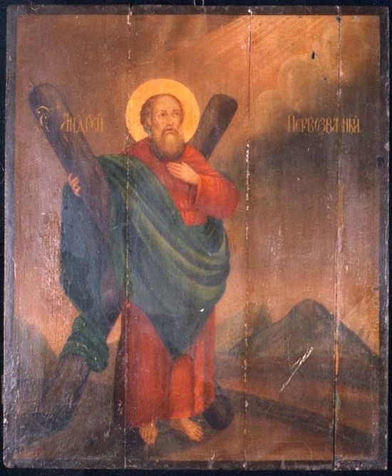 Эта деревянная икона св. Андрея Первозванного скорее всего принадлежит руке алеутского иконописца Василия Круикова. На фоне фигуры св. Андрея Круиков изобразил пейзаж острова Уналашка в Алеутском архипелаге с характерным для местности вулканом. Икона написана в 19 в. масляной краской на холсте с использованием шеллака – естественной смолы. Ее размер – примерно 58 x 41 см. Икона св. Андрея – часть иконостаса Собора Святого Вознесения Господа Нашего в г. Уналашка. Круиков, по свидетельству о. Иоанна, научился писать иконы сам. Он также был известен благодаря своим портретам, которые, к сожалению, не сохранились. О. Иоанн очень ценил работу этого художника и иконописца.Интересен выбор святых для своих икон алеутскими иконописцами: и св. Андрей Первозванный, и Архангел Михаил традиционно считаются покровителями Руси.
