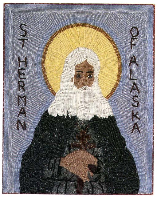Икона св. Германа Аляскинского создана в 1992 г. мастерицей бисероплетения из народности Кониаг (Алютиик) Элеанор Наумофф, деревня Старая Гавань, Аляска. Св. Герман – один из первых русских православных миссионеров на Аляске и один из четырех православных святых, к которым также относятся св. Иннокентий и святые мученики Ювеналий и Петр-Алеут. Уникальность иконы заключается в использовании стеклянного бисера и особой кропотливости труда Наумофф. Размер иконы – 36 х 29 см. Бисероплетение – древняя традиция народности Кониаг, которая в основном используется в декоративных целях. Икона св. Германа – пример того, как православная иконография стала новым источником вдохновения для местных мастериц.