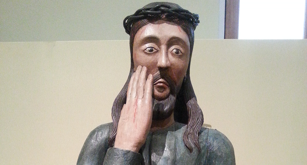 «Спас в темнице» на выставке памятников пермской деревянной полихромной скульптуры в ГИМ (Москва) «Христианские древности Пермского края». Фрагмент скульптуры