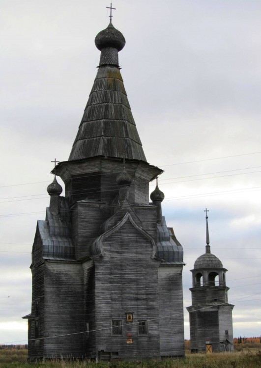Именно здесь, на берегу Онеги, возвышается каким-то чудом уцелевший ансамбль – одна из самых высоких деревянных церквей в мире и колокольня.