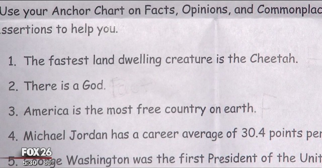The activity, which was intended to encourage critical thinking skills and dialogue by engaging students in an exercise wherein they identified statements as fact, opinion, or common assertion was not intended to question or challenge any student's religious beliefs as reported by some media outlets.