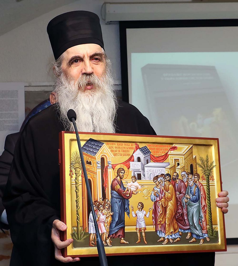 Проф. др Војислав Миловановић, протонеимар Спомен-храма Светог Саве, је у знак захвалности за све учињено за враћање Веронауке у српске школе, у своје лично име, у име проте Милана Јанковића и свих нас, уручио Владици Иринеју икону Господа Христа са децом.