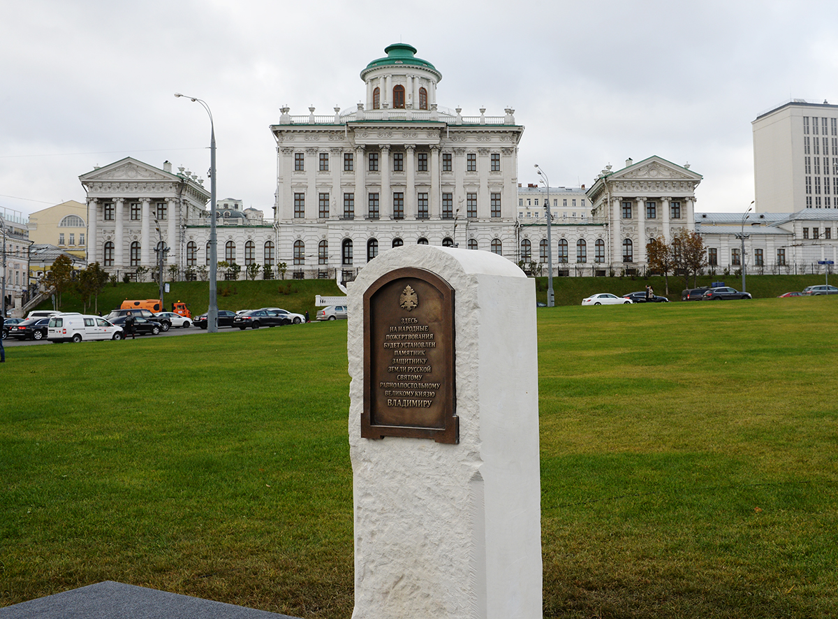 Закладной камень на месте установки памятника святому равноапостольному великому князю Владимиру был доставлен в Москву из Херсонеса (Крым), где по историческим свидетельствам в 988 году состоялось крещение великого князя Владимира.