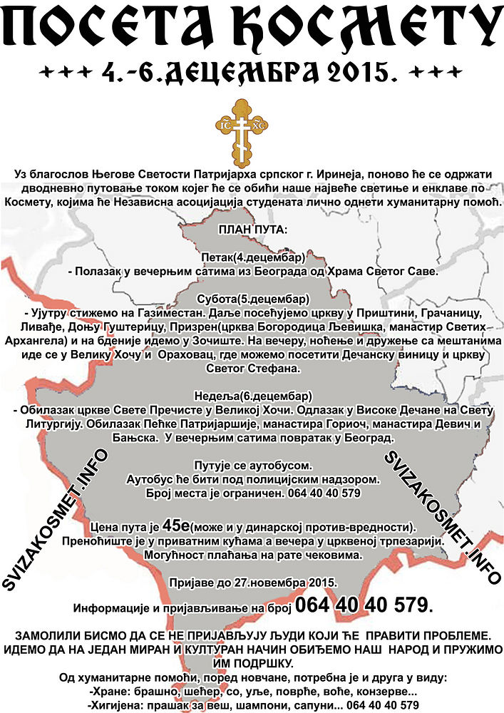 Уз благослов Његове Светости Патријарха српског г. Иринеја, поново ће се одржати дводневно путовање током којег ће се обићи наше највеће светиње и енклаве по Космету, којима ће Независнa асоцијацијa студената лично однети хуманитарну помоћ.