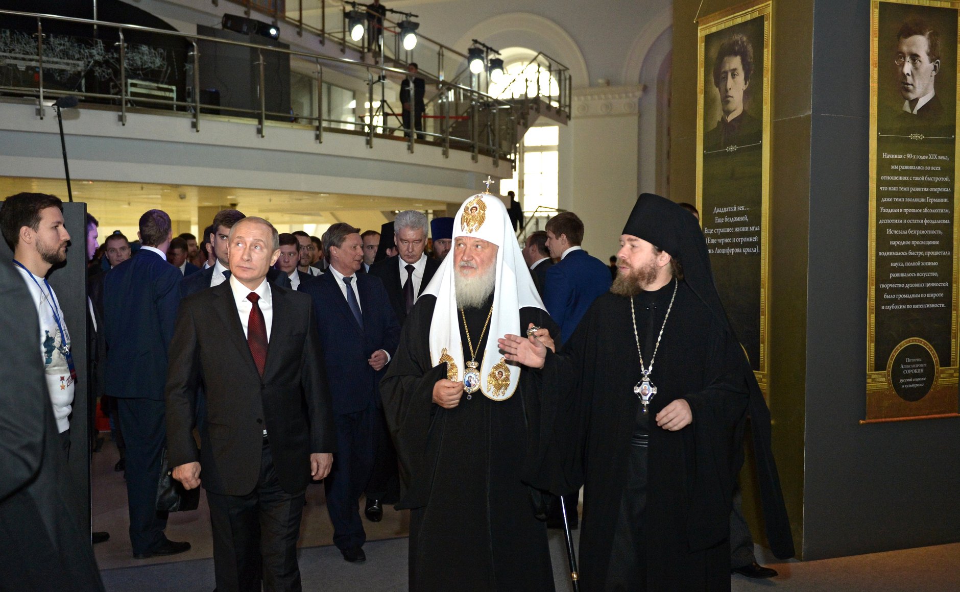 В.В. Путин и Святейший Патриарх Кирилл осмотрели экспозицию выставки. Пояснения давал ответственный секретарь Патриаршего совета по культуре епископ Егорьевский Тихон.