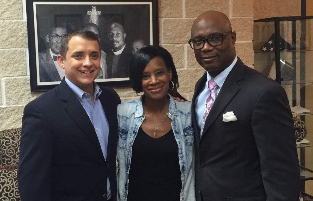 Одна из уволенных - Маделин Керкзи - со своим адвокатом (слева) и епископом Джеймсом Диксоном (справа)