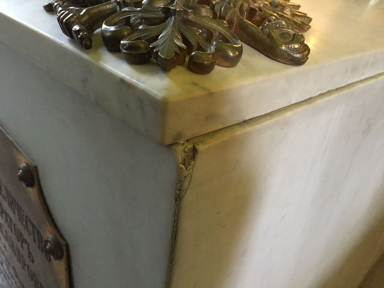 Ево шупљина у белом мермерном зиду надгробног споменика – овде је требало да се налазе управо оне металне пречаге које повезују мермерни поклопац надгробног споменика. Нема их. А безусловно треба да постоје. Има осам шупљина – горе и доле, и оне су празне.