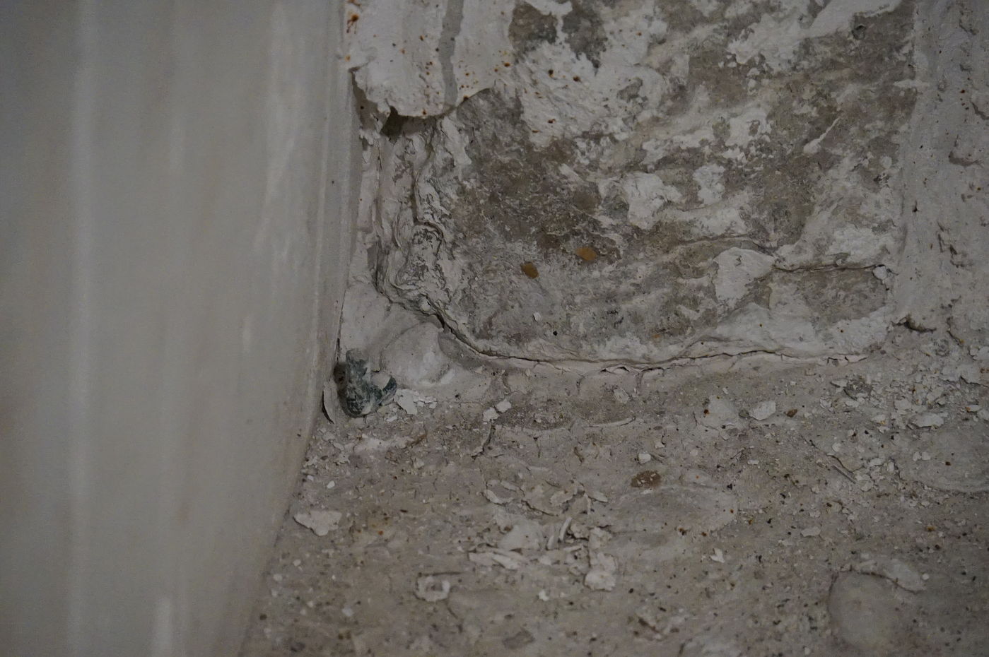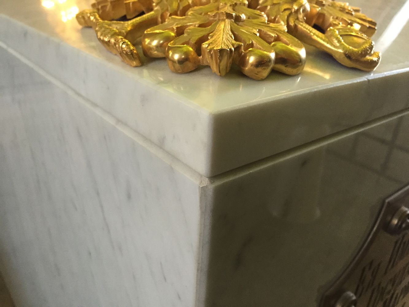 Видите шут – такве ствари се не дешавају кад су у питању царске гробнице. А ево грубо попуњених углова надгробног споменика. Јасно се виде трагови сивог старог азбеста, исто као и бели трагови грубо премазаног, очигледно каснијег, слоја гипса. Негде има можданика који повезују углове мермерних зидова, а негде их нема.