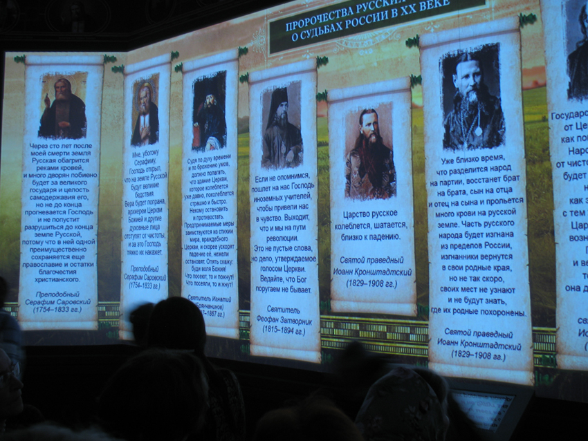 Или, скажем, зал христианских новомучеников. Он выполнен весьма креативно: ты будто попадаешь в длинную пещеру, где по стенам, словно иконы, висят портреты священников, пострадавших за веру. В каждом портрете – калейдоскоп сменяющихся фотографий, освященных колеблющимся языком свечи, а рядом – их мысли, предсказания, пророчества.