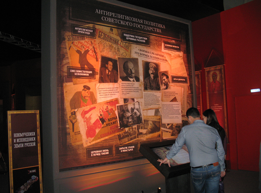 И эта икона словно задает определенный настрой всей экспозиции. Потому и в других залах Манежа посетители открывают для себя то прекрасные, а то и трагические страницы из жизни Русской Православной Церкви. Чего, например, стоит мультимедийный экран, рассказывающий о том, как Русская Православная Церковь в страшные годы революционного террора спасала миллионы умирающих от голода жителей России, – в то время как большевистское правительство целенаправленно уничтожало саму Церковь, расстреливало священников, ломало и грабило храмы.