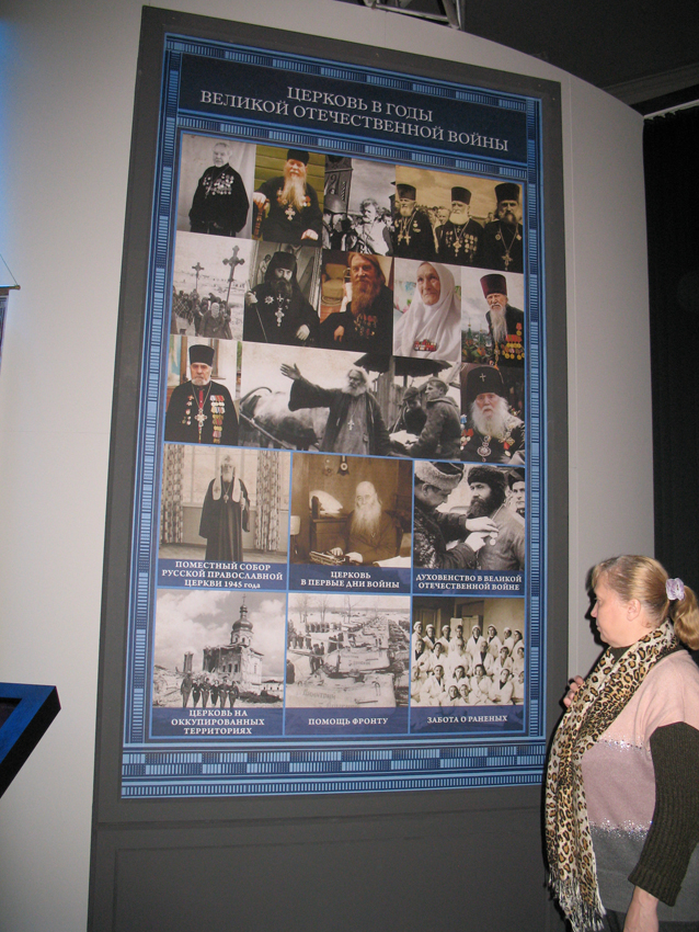 Отдельный стенд-экспозиция посвящен деятельности Церкви в годы войны. На нем – фотографии сражавшихся за родину священников с орденами и медалями и рассказ о том, как Церковь помогала фронту, как заботилась о раненых в тылу…