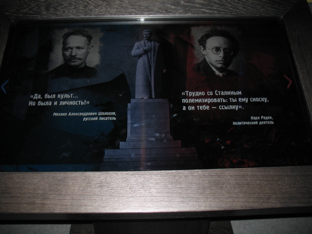 Мультимедийные интерактивные экспозиции дают не просто готовую информацию, а предлагают посетителю подумать, проанализировать, сопоставить, разобраться и самому сделать вывод. К примеру, модуль, посвященный… Сталину. Как в калейдоскопе, на нем меняются картинки, содержащие различные высказывания о нем: одни его хвалят, другие – высмеивают… Вот и получается, что на левой стороне фраза писателя Михаила Шолохова«Да, был культ… Но была и личность!», а на противоположной – остроумное, хотя в то же время и трагическое наблюдение-предвидение политика и журналиста Карла Радека:«Трудно со Сталиным полемизировать: ты ему сноску, а он тебе – ссылку».