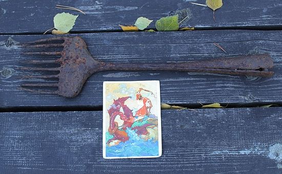 Находка в хорошем состоянии: это кованая острога с восьмью зубцами, каждый из которых имеет на концах зазубрины. У классика рыболовного дела зоолога Леонида Сабанеева подробно описана охота на рыбу, преимущественно на линя, именно такого типа острогами. Называлась такая добыча рыбы лучением и, видимо, практиковалась монахами Яменской пустыни в окрестных озерах и старицах постоянно.
