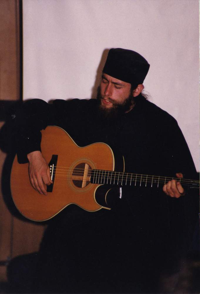 Marler plays guitar at an Eastern Orthodox monastery on a remote island in Alaska in 1996. The monastery was a satellite location of St. Herman Monastery in Platina, Calif., where Marler began his monastic training. (Courtesy of Justin Marler)