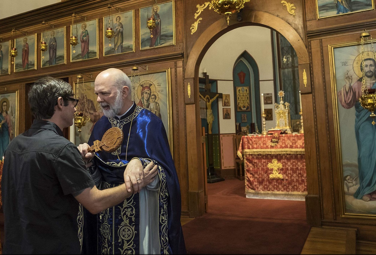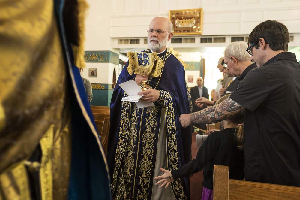 Marler reaches out to touch the robe of the Rev. David Barr as he walks past during services at St. Elias Orthodox in Austin. (Rodolfo Gonzalez/American-Statesman)