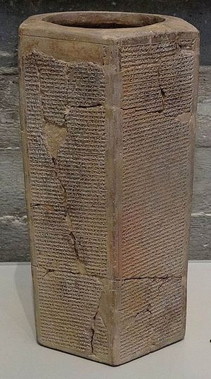 The Sennacherib Prism on display in the Israel Museum in Jerusalem. Photo: Hanay’s image is licensed under CC BY-SA 3.0/ Wikimedia Commons.