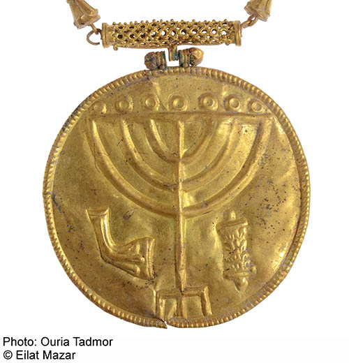 The prize find of the so-called Ophel treasure unearthed in the Ophel excavations is a gold medallion featuring a menorah, shofar (ram’s horn) and a Torah scroll. Photo: Courtesy of Dr. Eilat Mazar; photo by Ouria Tadmor.