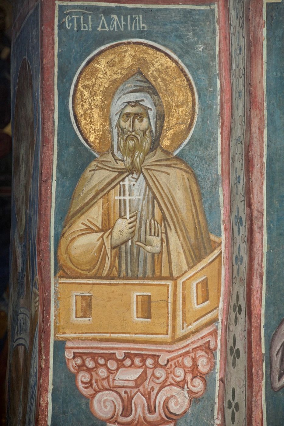 Началом досточудного сего жития и источником всех происшедших отсюда последствий было следующее. Сердце Даниила воспылало божественною любовью и он возымел непреодолимое желание поклониться Святым местам, где пострадал за нас Господь наш Иисус Христос, где Он был погребен и воскрес и откуда Он вознесся на Небеса. Вместе с тем он горел духом увидать великого подвижника того времени — святого Симеона Столпника[5]. Пришедши к игумену, он открыл пред ним свое желание и просил отпустить его в избранное им путешествие. Игумен на этот раз удержал Даниила; но потом, сам имея надобность, ради нужд церковных, идти в Антиохию[6], взял с собою Даниила и еще несколько человек из братии. Когда они дошли до селения, называемого Тиланиссой, в недалеком расстоянии от которого подвизался святой Симеон Столпник, то отправились к его столпу. Видели они суровость той местности, высоту столпа и узнали, что несмотря ни на что, сей подвижник терпит на столпе своем и зимний холод, и летний зной, и ветры и дожди. Некоторые неразумные думали, что святой претерпевает всё это из тщеславия; но блаженный Даниил не только удивлялся его терпению, но и сам побуждался к подражанию ему. Когда пришедшие иноки, стоя внизу, окликнули, святой Симеон, взглянув на них сверху, велел приставить лестницу и, если хотят, войти к нему. Тогда и обнаружилось, кто как относится к преподобному: один сказался больными ногами, другой отказался за старостью, а иные уклонились и еще по некоторым другим немощам; Даниил же, взойдя на лестницу, быстро вошел по ней и с радостью приветствовал великого Симеона. И не напрасны оказались труды его, ибо сначала он выслушал от подвижника наставление и подвигся чрез это еще более к добродетельной жизни; затем Даниил сподобился от него благословения, подаваемого чрез возложение рук, и, наконец, услыхал от него о своей будущей жизни. Подвижник, обращаясь к нему, пророчески говорил ему: