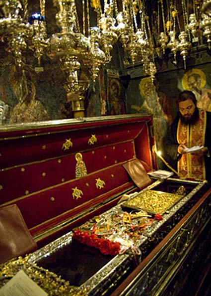 That night in a dream, the governor saw a man in a monastic habit saying to him, "Why are you bothering me, and why are you upsetting my children (i.e., the priests)? Know that what you are intending to do is not in your interest." At daybreak he called the theologian into his room (that is, the one who gave him the idea) and related to him the dream in detail. The theologian said, "As Christians, we are obliged in no way to believe dreams, nor are we to accept them at all as real. You should certainly consider this, my lord, to be an obvious temptation of the devil, with which the adversary troubles the good, in order to amuse himself and impede such a most-pious deed." The governor calmed down, fully convinced by the theologian's words. That night, the governor again saw the same monk in a dream threatening him harshly saying, "Know, most certainly, that if you bother my holy house, you will regret it, as it is of no profit." The ruler was terrified by this steadfast decree. He did not again wait for daybreak, but straightaway called for the theologian. He told him every detail about the vision, described his faint-heartedness and said that he was overcome by such fear, that he not dare go through with the task. Then the theologian speaking up and poising himself nobly, said, "My lord, know, that if you grow timid from doing this holy deed that you have decided upon, you will appear to people as not being of proper judgement, since you believe in dreams conjured up by the devil." The governor was filled with courage by these words and as day came on, which was the 11th of November 1718, he went to the church of the saint so as to venerate. He was accompanied by those of his court (along with the city's engineer) in order to measure the area according to length, width, and height for the construction of the altar. At that time, the oldest of the priests, Marinos Voulgaris Sakellarios, and the priest in charge, Spyridon Voulgaris (the great protopresbyter), stood before the governor and with humble voices begged him not to go through with such a modification, as it might not seem best to the saint. When he heard them, however, he flew into a rage, threatening that if they did not do as he wished and become silent, he would send them to Venice in chains, to be thrown into prison, never again to see the light of day. "I am not intending to do some unlawful deed," he said, "but to set up an altar, a holy and God-pleasing work!" The priests were cast into despair and terror-stricken by his threats, and with the other orthodox present - who were not few - they ran towards divine assistance. Opening the holy reliquary of our great father, they chanted a paraklesis, shedding abundant tears, hoping to hinder the governor's bad intention.