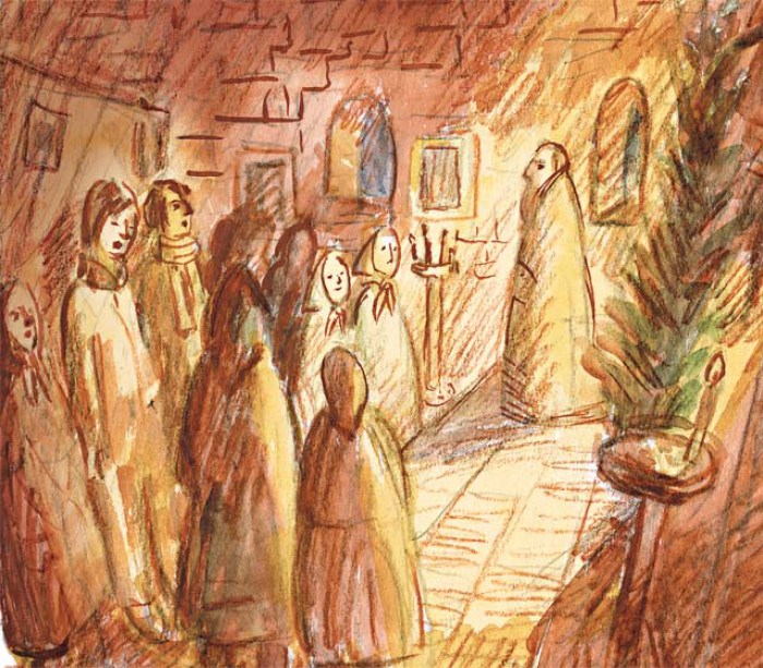 Пением на клиросе заведовала удивительная женщина — Лариса Михайловна. Еще в советские времена она с благословения архиерея на два года уходила петь в старообрядческий храм, чтобы освоить сохранившийся там древний знаменный распев, или, как его еще называют, «пение по крюкам» (из-за специфической системы записи этого распева, где ноты напоминают крюки и топорики). Освоить-то она его освоила… А вот хор ей достался небогатый: три бабульки с дребезжащими от старости голосами. Мужских голосов не то чтобы не хватало — их вообще в хоре не было. Поэтому, увидев в храме двух незнакомых парней, Лариса Михайловна пошушукалась со Стасом и тут же утащила нас с Вовкой к себе на клирос.