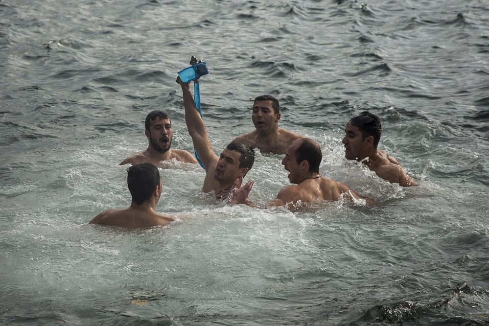 A group of faithful leaped into the frigid waters of the Golden Horn inlet to retrieve a wooden cross thrown by Bartholomew. Nicolaos Silos, a 28-year-old visitor from Greece, was the first to reach it.