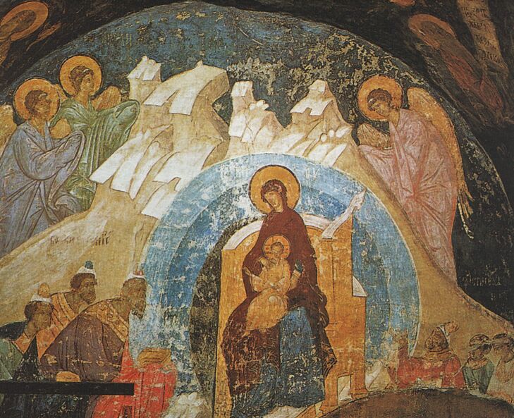Волхвы вошли в помещение. Маленькая пещера была освещена огнем гаснущего в углу очага. Рядом с ним сидел, приподнявшись со своего ложа, старик. Еще две женщины (одна из них отворила волхвам дверь) стояли у стены. В другом углу, спиной к вошедшим, стояла на коленях склонившаяся Женщина, и только услыхав слова волхвов: «Мы пришли увидеть родившегося в Вифлееме Царя Иудейского», Она оглянулась. И быстро поднявшись, отошла тотчас в сторону. Волхвы увидели лежащего в яслях Младенца. Он смотрел в их лица.