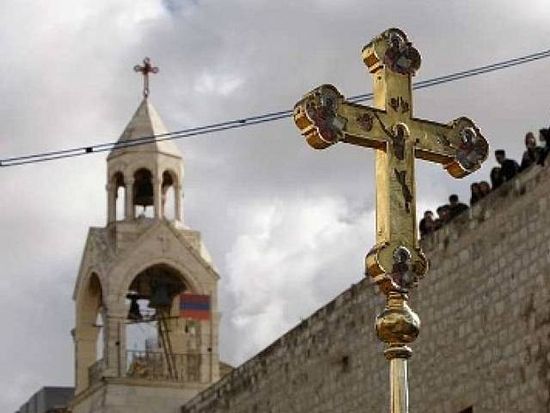 A crucifix is held up in front of the Church of the Nativity during the Orthodox Christmas procession in the West Bank town of Bethlehem January 6, 2011. PHOTO: REUTERS